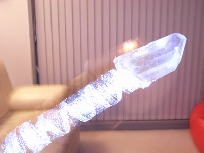 My wand is made from a 75 year old Elm tree, and is adorned with a magical quartz crystal containing a crystal deva. Leane's daughter Erynn does Deva readings and has given me the following information: